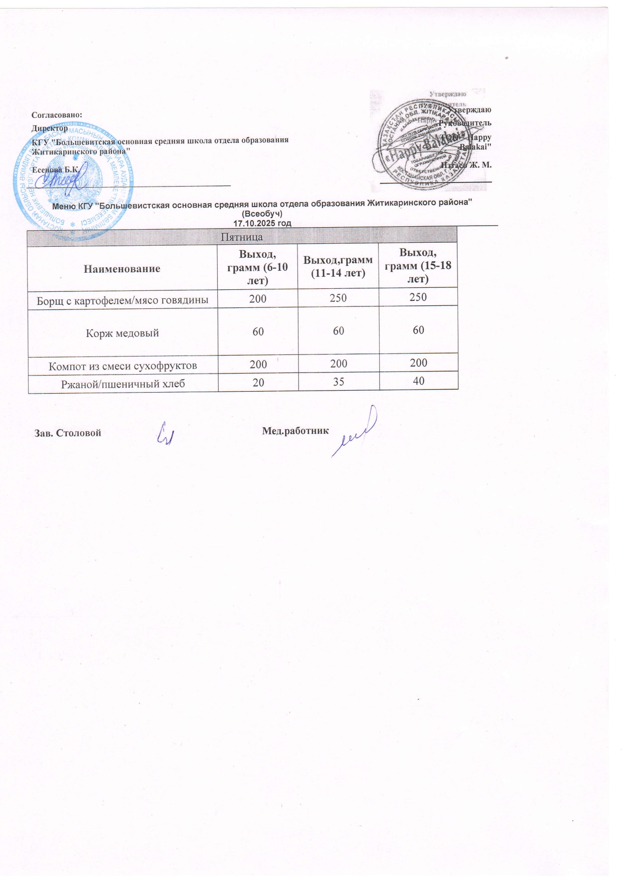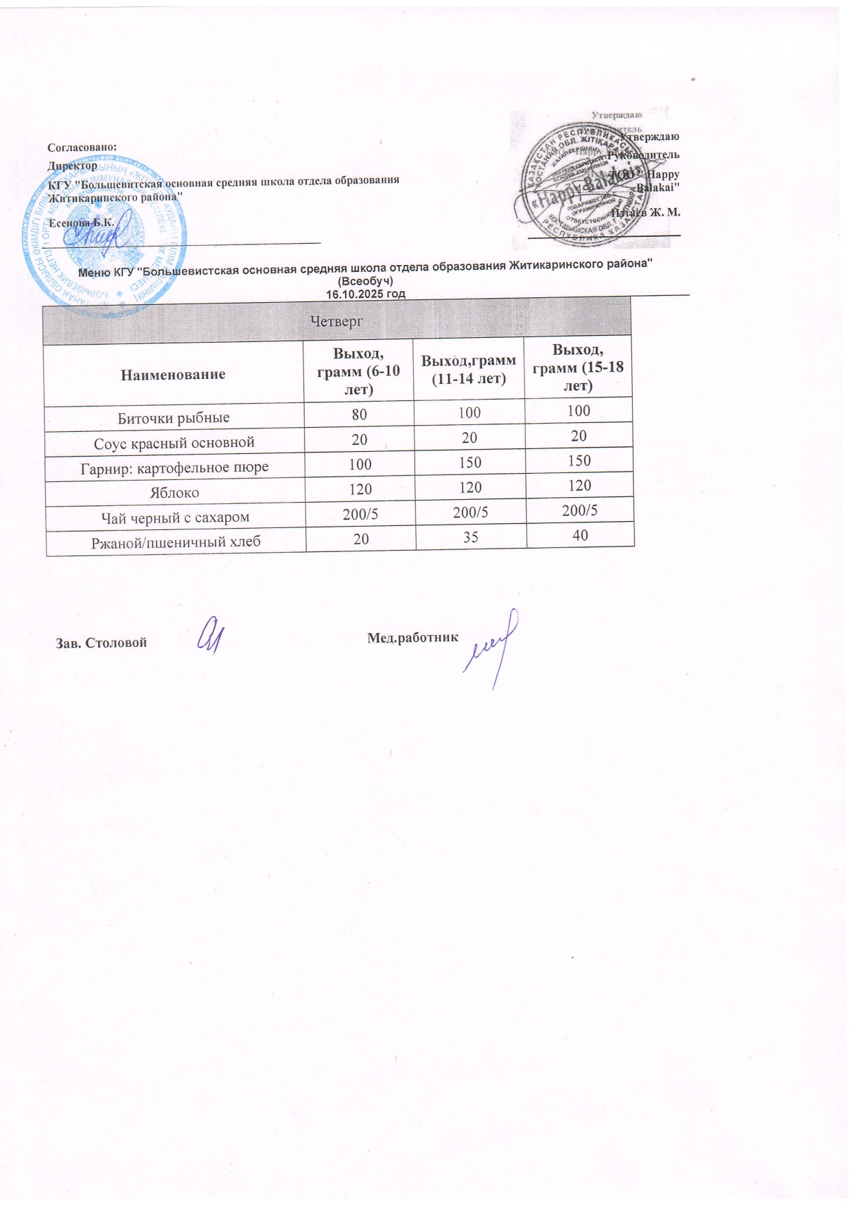Меню КГУ "Большевистская основная средняя школа отдела образования Житикаринского района"
